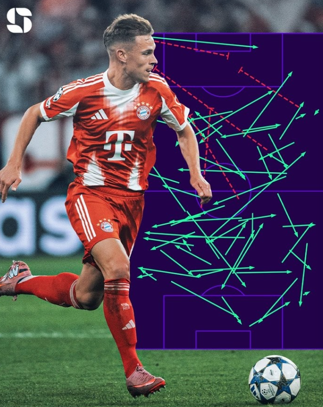 作为球队的组织核心,基米希本场在传球方面再次展现出世界级水准。他全场**共计传球65次,成功62次,传球成功率高达95%**。其中不乏向锋线的威胁输送及向边路的大范围转移, continually为拜仁的进攻梳理方向和保持控球优势,使球队整体进攻流畅而有序。